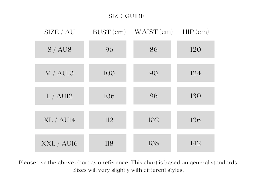Our label size is designed to follow standard Australian women’s sizes, some styles may vary from these measurements but you can still use the size chart as a guide.